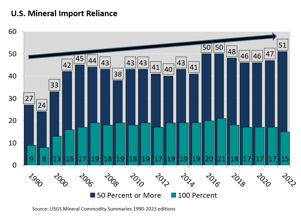 WASHINGTON, D.C. – The USGS today released its annual Mineral Commodity Summaries report, which found the U.S. is more import reliant than ever for the minerals needed by our manufacturing, technology, energy, transportation, infrastructure and defense sectors. In 2022, imports made up more than one-half of the U.S. apparent consumption for 51 nonfuel mineral commodities – up from 2021, when we were import dependent for more than one-half of the U.S. apparent consumption for 47 nonfuel mineral commodities. Digging into that deepening import dependence, China is the top supplier of the minerals our economy needs.